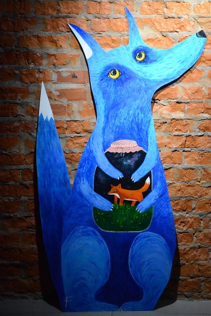 «Голубая шестилапая лиса Надя с планеты Блю-блю держит в лапах банку, которой находится рыжая лисица с растерянным взглядом. Трактовок может быть сколько угодно. Может быть, голубая лиса – это просто пришелец, похищающий земной образец. Ну, а если копнуть глубже, то не окажется ли, что всё это лисье действо – лишь интерпретация психологического состояния человека, который снаружи синяя большая лиса с когтями, но где-то внутри бережно хранит красивую банку с испуганной и маленькой лисичкой…», - гласит надпись на табличке, расположенной рядом с лисицей.